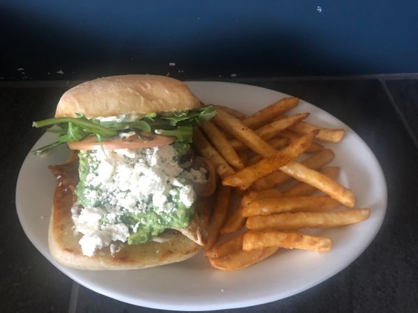 Marinated grilled chicken, bacon, feta, guacamole, jalapeño aioli
