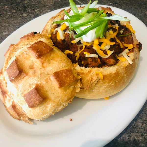 Garnished with feta , toasted panko, green onions, sourdough bread bowl, tortilla