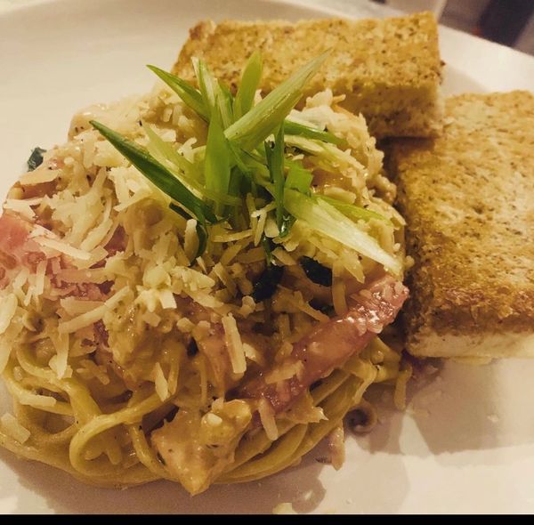 AAA sirloin strips, button mushroom, rich white wine garlic sauce, noodles, garlic toast