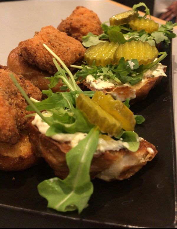 Sweet, tangy breaded chicken bites with a hint of heat, peanuts, green onions, pickled radish, gochujang aioli