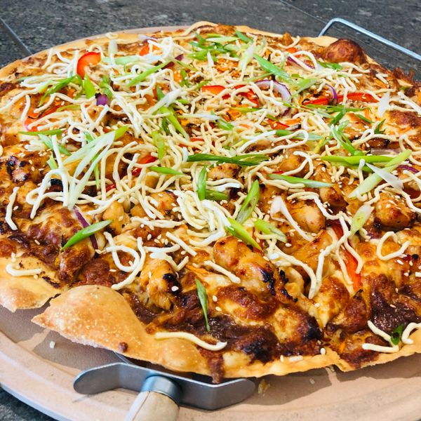 Shredded chicken, mozzarella, red onion, cherry tomatoes, red peppers, tangy BBQ sauce, fresh cilantro, green onion